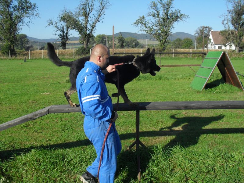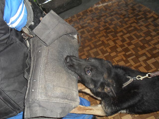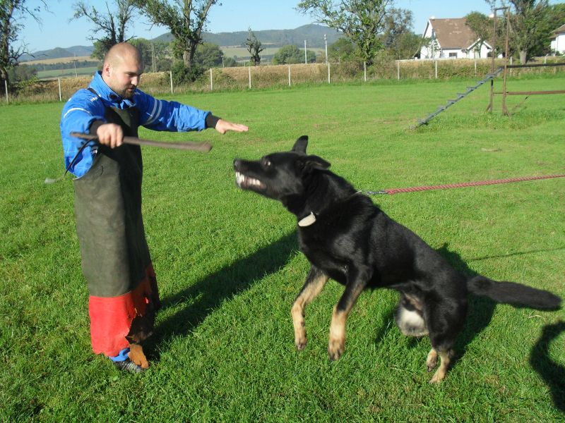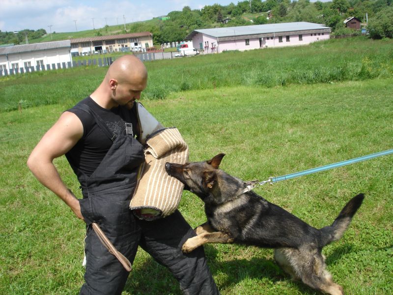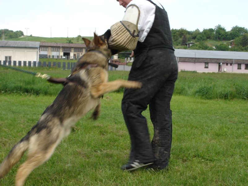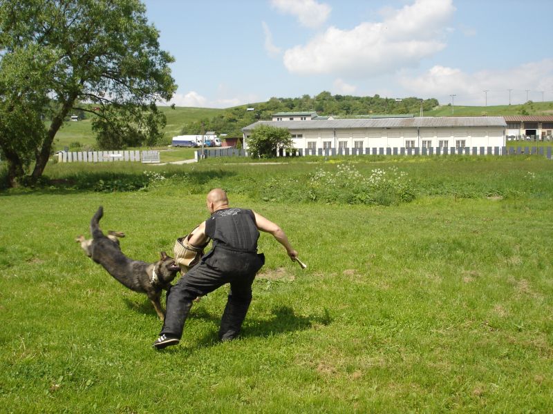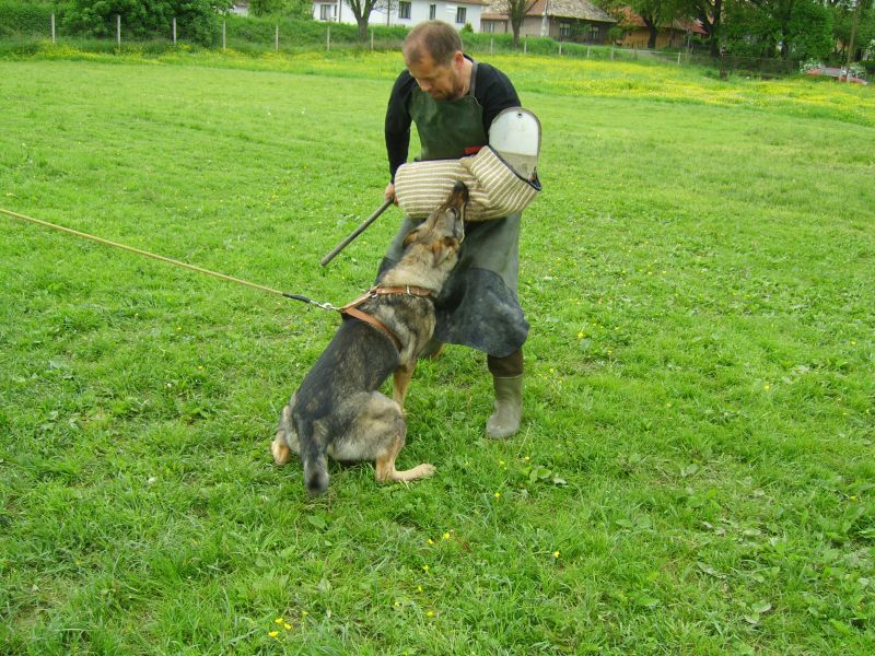 We do this test moslty in building places (old buildings, factories, abandoned hotel, our own training place) where we can simulate all possible things which a dog can encounter with. Dog has to show courage to attack an intruder without hesitation. We test dogs with or without helper (dog can be tied up to something, or let loose inside a building). Dog has to stand the ground a defend him or the handler. Dogs has also be able to find a hidden prey in boxes, cupboards etc. He has to be able to reach for prey if its on a high place. He cannot hesitate to jump over something for a bite or not to back off from a bite when something unexpected happens (weird noises, something fall on the ground etc.)