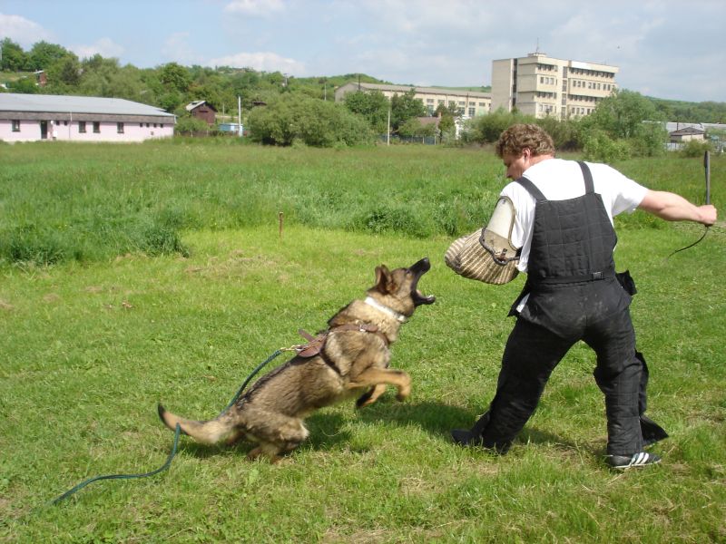 This test includes a bite with or without handler, long distance bite, defense while tied on a pole or defending a handler. Every dog has to defend his teritory without a handler. To test a resistance of a gunshot is a must.